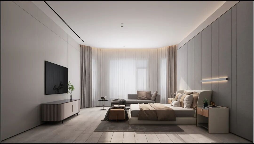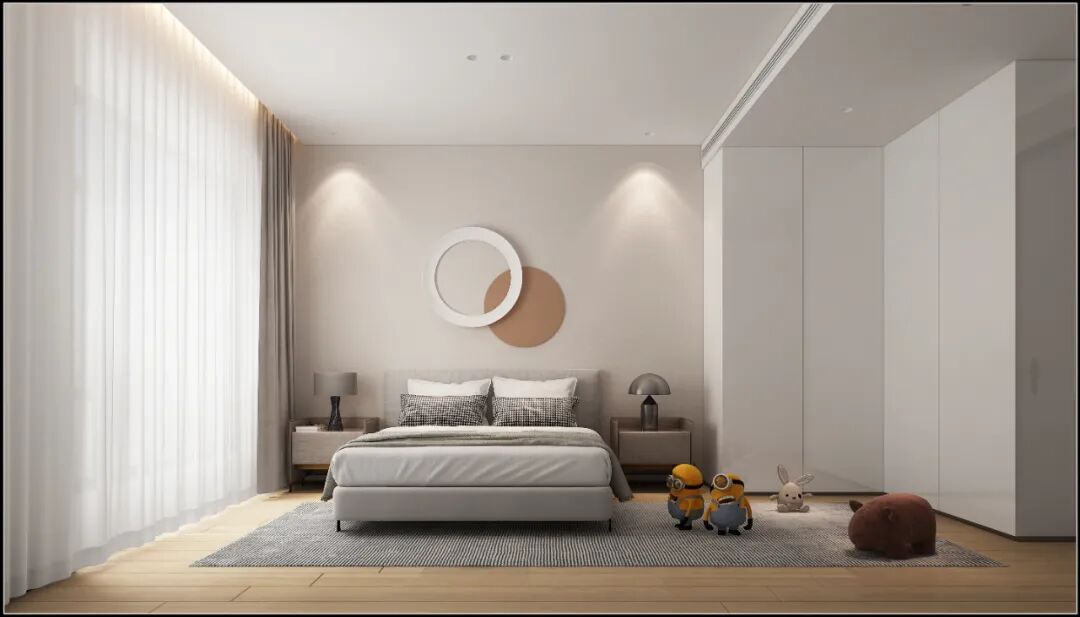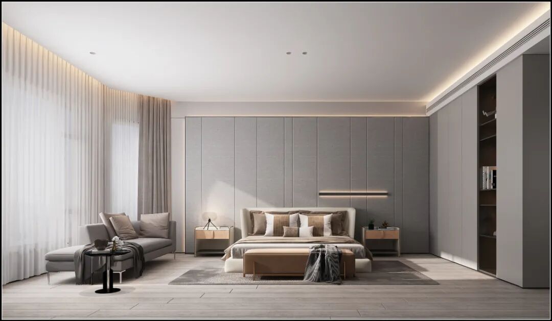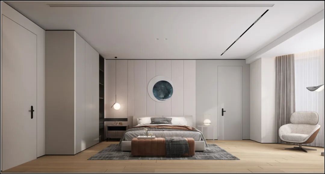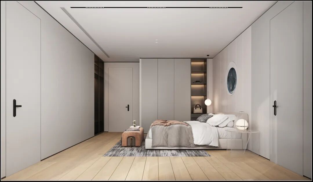 三个卧室皆在高级灰的主色调下融入温暖的木驼色,中性的柔和色调,高级有质感。