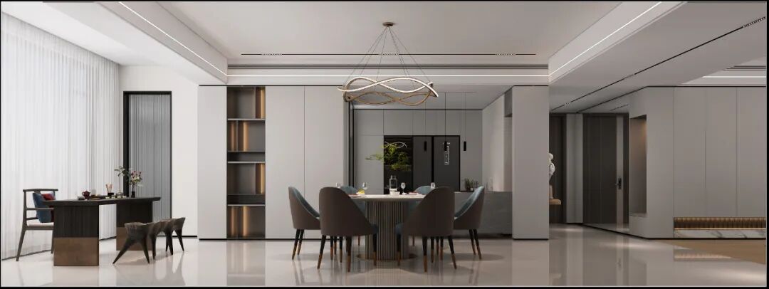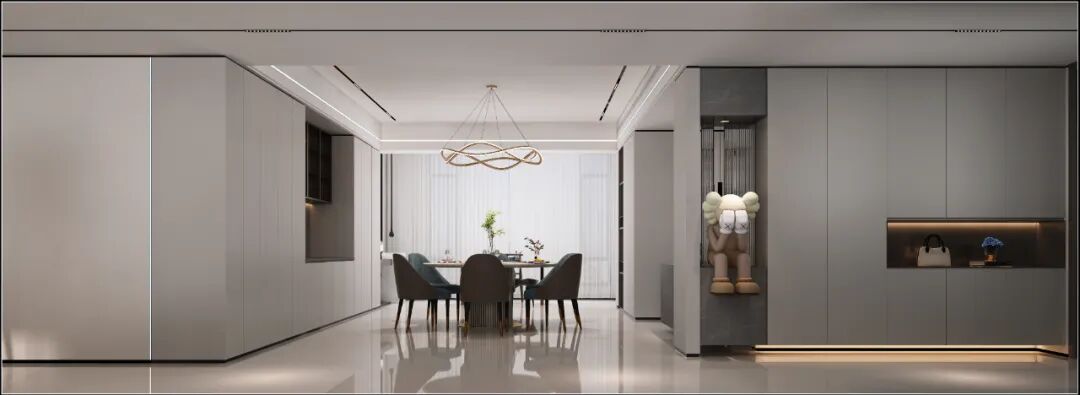 住宅整体由金属质感的高级灰,乳白色,大理石等元素构成,利用中性淡雅的色调,简约的直线条来融合空间。